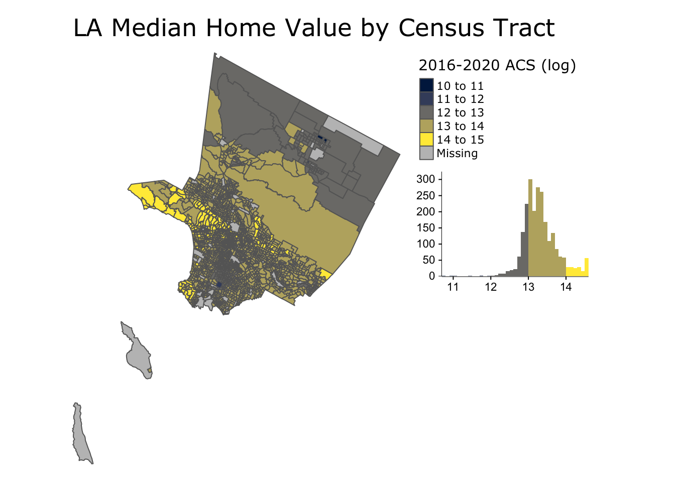 (la_median_value_log_hist_tm <- la_census_data[!st_is_empty(la_census_data),,drop=F] %>%