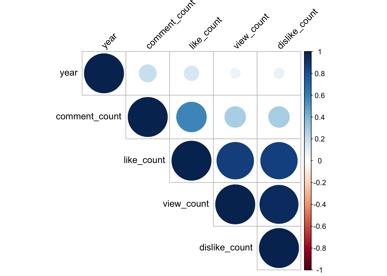 All the numeric variables in our data set are positively correlated, albeit to different extents. Consider the relationship between dislike count and year, the correlation is very small. In contrast like count and view count are very strongly positively correlated, implying that as the number of views increases so too does the number of likes.