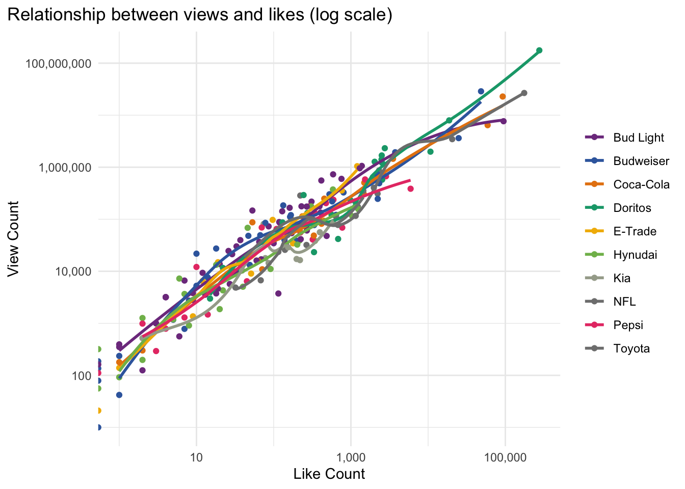 ggplot(aes(like_count,view_count, color=brand))+
