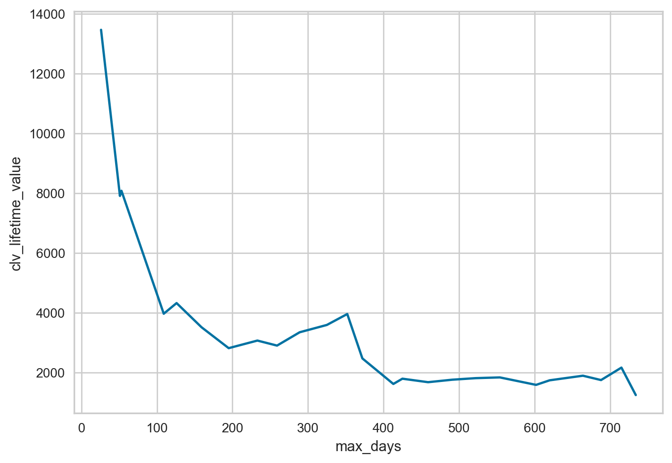 The output above emphasizes the idea that groups of customers with similar habits (when they started transacting). In addition different cohorts have different churn rates an lifetime values. For instance, consider the bottom three cohorts, who started transacting either in 2013-10, 2013-11 or 2013-12. They all have substantially higher customer lifetime value relative to the average, however, all three also have very high churn rates 80%+. From a business point of view this would suggest that these are customers that we want to keep engaged such that they continue generating value and especially due to their high likelihood of churning. Why might this be the case? The figure below visualizes the customer lifetime value over the max tenure of a customer cohort.