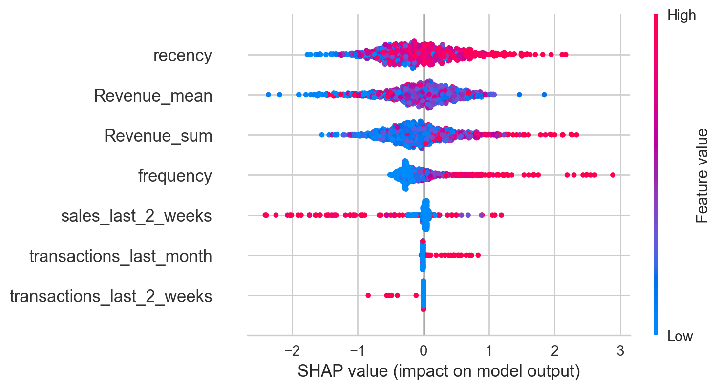 In contrast to the regression model, the most important feature for the classification model is the recency of the customer, higher values leading to a higher probability of transacting within the next 90 days. Like in the regression example the total revenue and average revenue are the next most important variables. The most important from the regression (frequency) is now the 4th most important, following a similar pattern in terms of effect on the dependent variable.